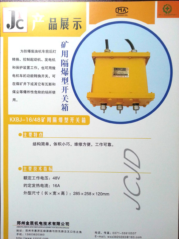 主要用途 为防爆柴油机车前后灯转换、控制起动机、发电机和保护装置工作,也可用做电机车的功能转换开关,可在煤矿井下或者其他有瓦斯和煤尘等爆炸性危险的场所使用。主要特点 结构简单,体积小巧,维修方便,工作可靠。主要技术指标 额定工作电压:48V 约定发热电流:16A 外形尺寸:285X258X120MM